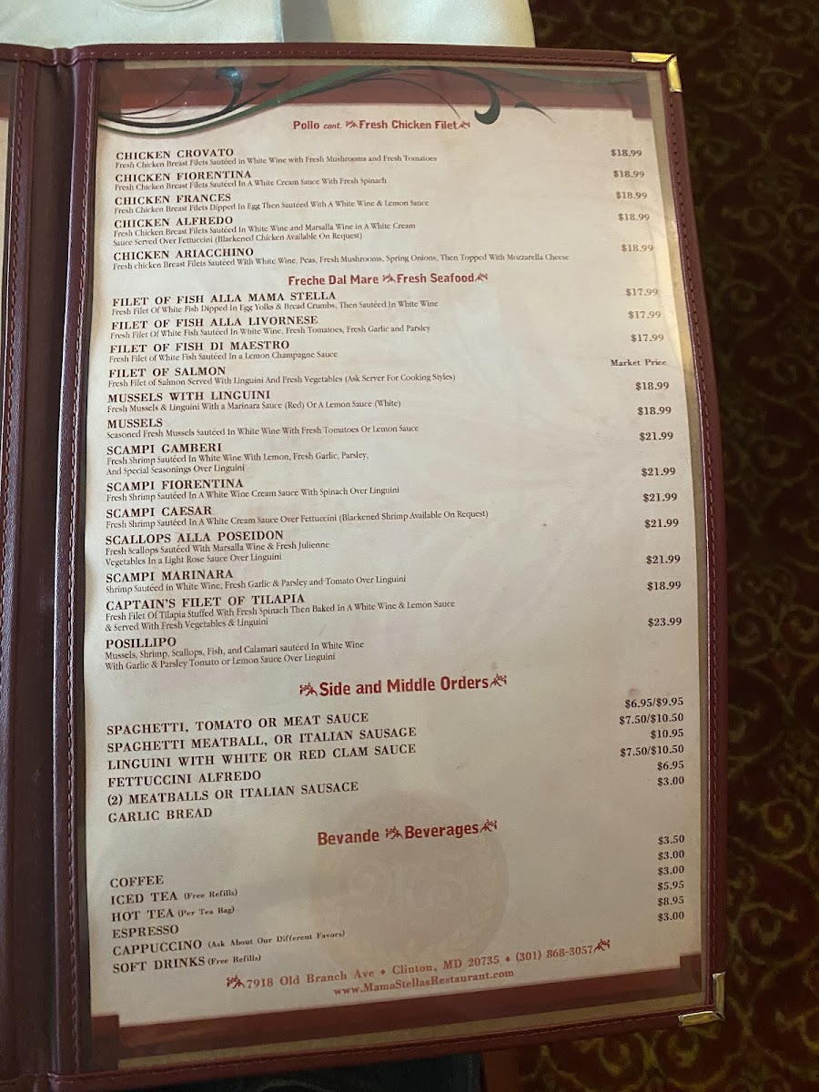 Fresh filet of tilapia stuffed with fresh spinach then baked in a white wine and lemon sauce and served with fresh vegetables and linguini.